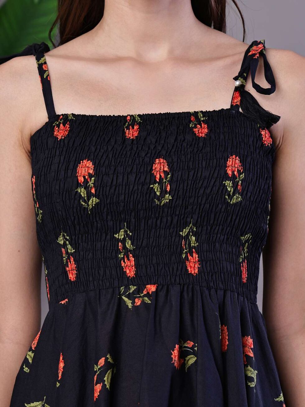Effortlessly stylish dress with a vibrant abstract print, tie-up shoulder straps, and a chic high-low handkerchief hemline ? perfect for casual days or evening gatherings.